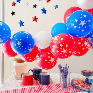 For the table-setting I picked up star balloon for the garlands at the DollarTree. And red, white, and blue foam stars also available at the DollarTree (painted white to black). The strips on the wall is wrapping paper (from the Christmas). And just added some fun star shape food.