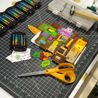 Once everything is cut out, assemble the felt, then glue together pieces (like the roof and doors) and/or sew the left side (only) remember it's a book. The sewing is up to you. I assemble the house into four pages. Then I used Artesprix Sublimation vibrant ink pads and stamps to create patterns, animals, and characters for the house. Then I added details like fabric flowers, glitter, ribbons, and eyelets for my book. Not necessary, but I'm all about the different types of textures. Make your own casita, and have fun with the details.